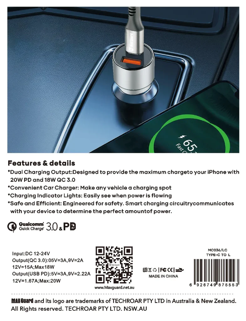 Maxguard 38W USB A+C car charge with Type-C to Lightning combo MC036LC